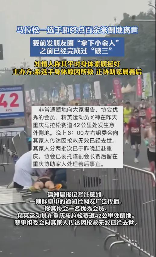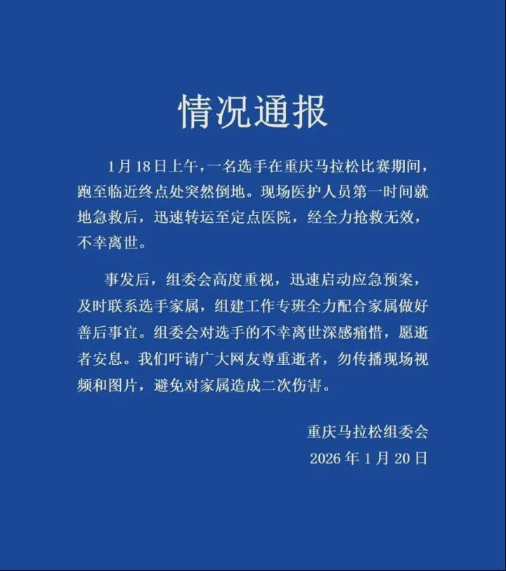 2.《重庆马拉松组委会通报:一选手赛末倒地离世,已启动善后》极光新闻2026-01-20